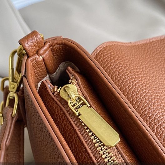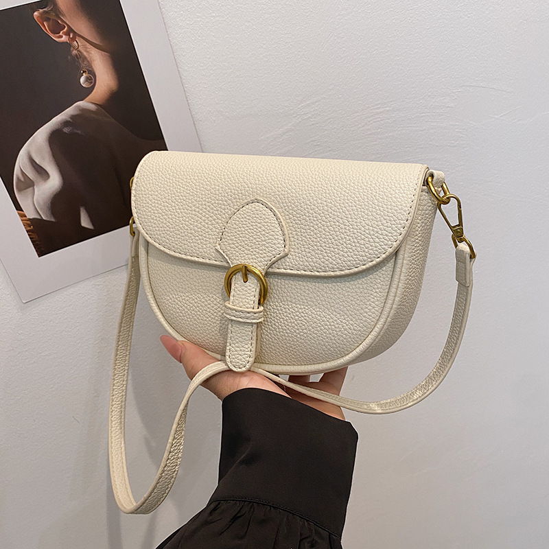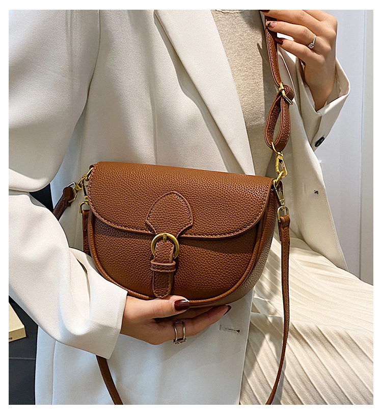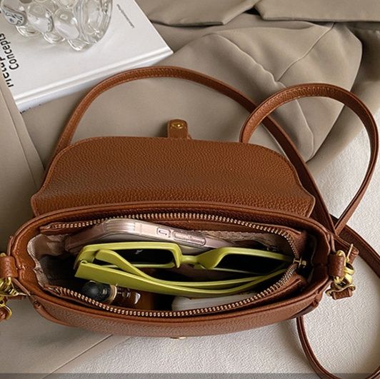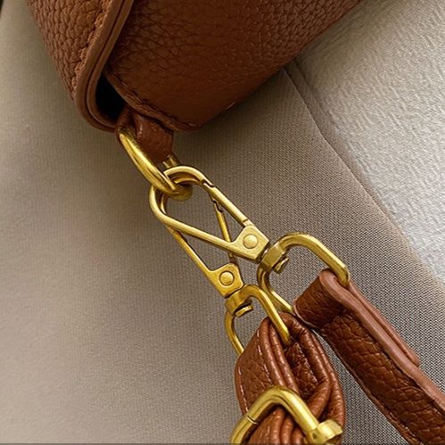 特徴的な馬蹄型の金具が目を引くデザインで、フラップ式の開閉が使いやすさを実現しています。
