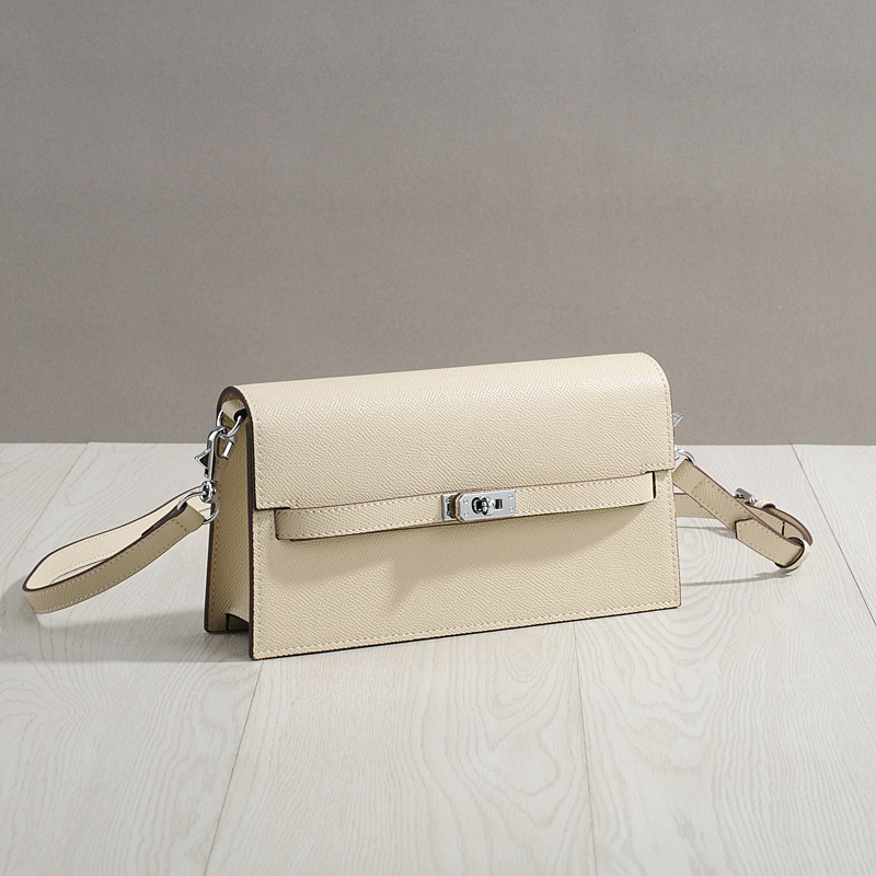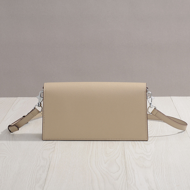 型押しレザーの上品な質感と、フロント部分の金具がアクセントになっており、大人の女性らしさを演出します。