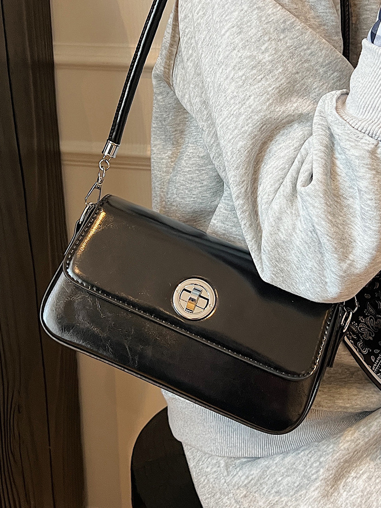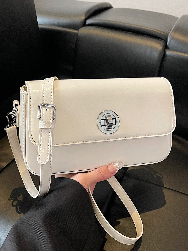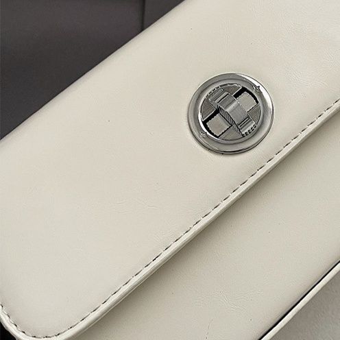 フロントの円形ターンロック金具がアクセントになった、エレガントなデザインの大きめポシェットです。