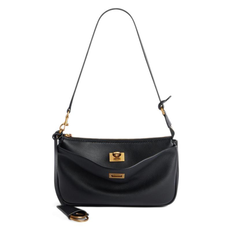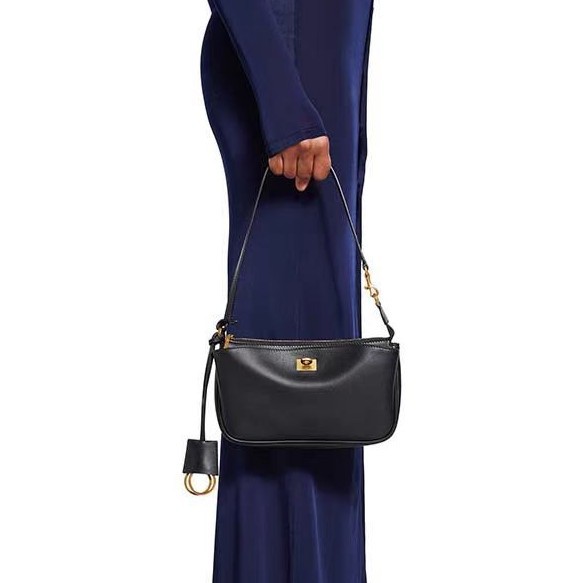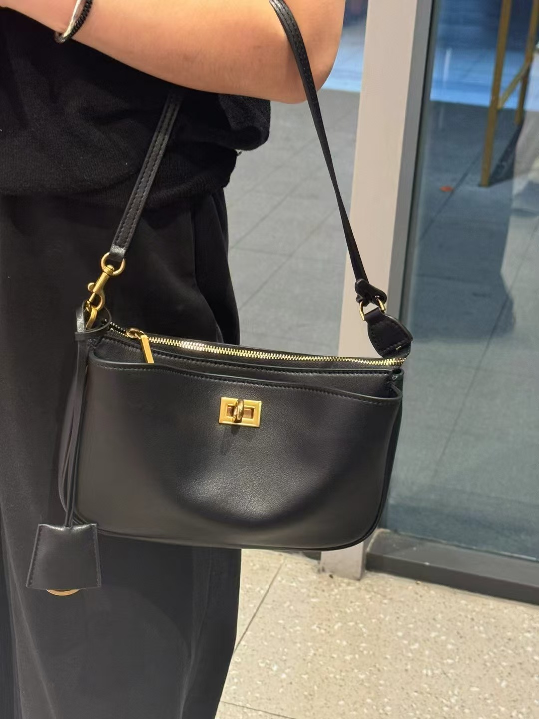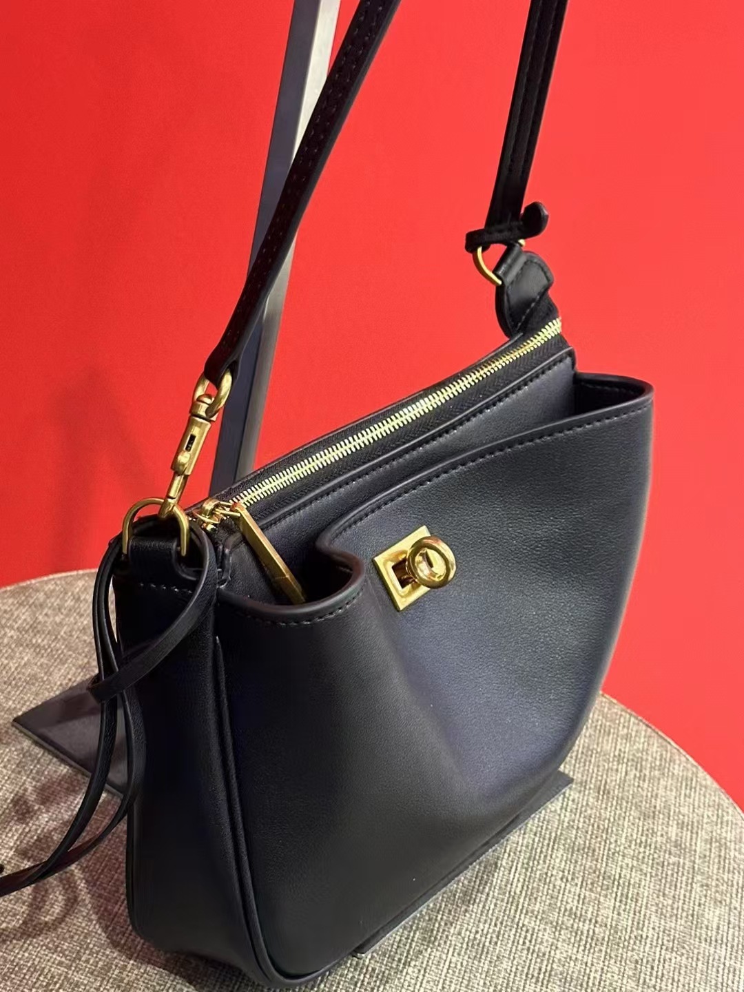 フロントの金色のターンロック金具とファスナーが高級感を演出し、大人の女性にふさわしい洗練された印象を与えます。