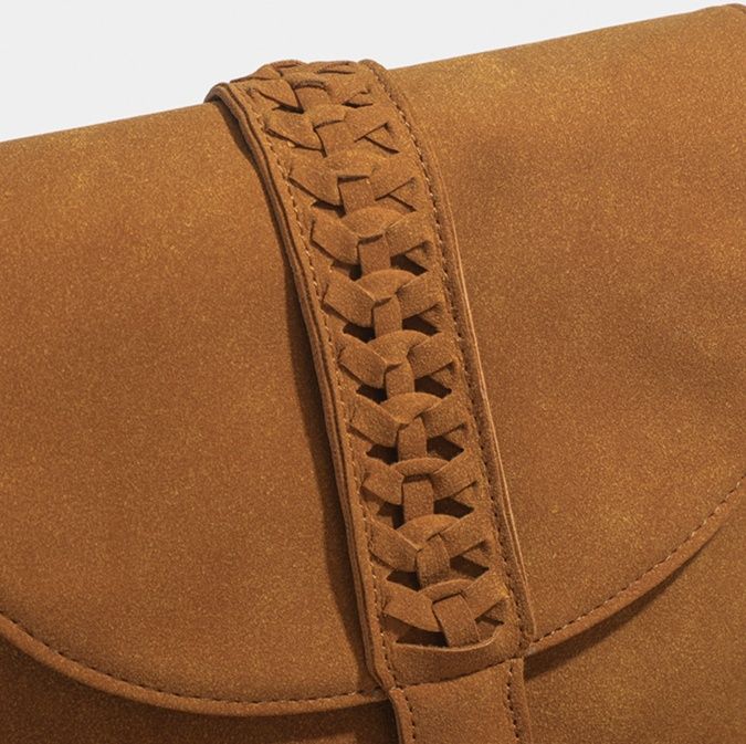 スエード調の上質な素材感と編み込みデザインのベルト部分が個性を演出します。
